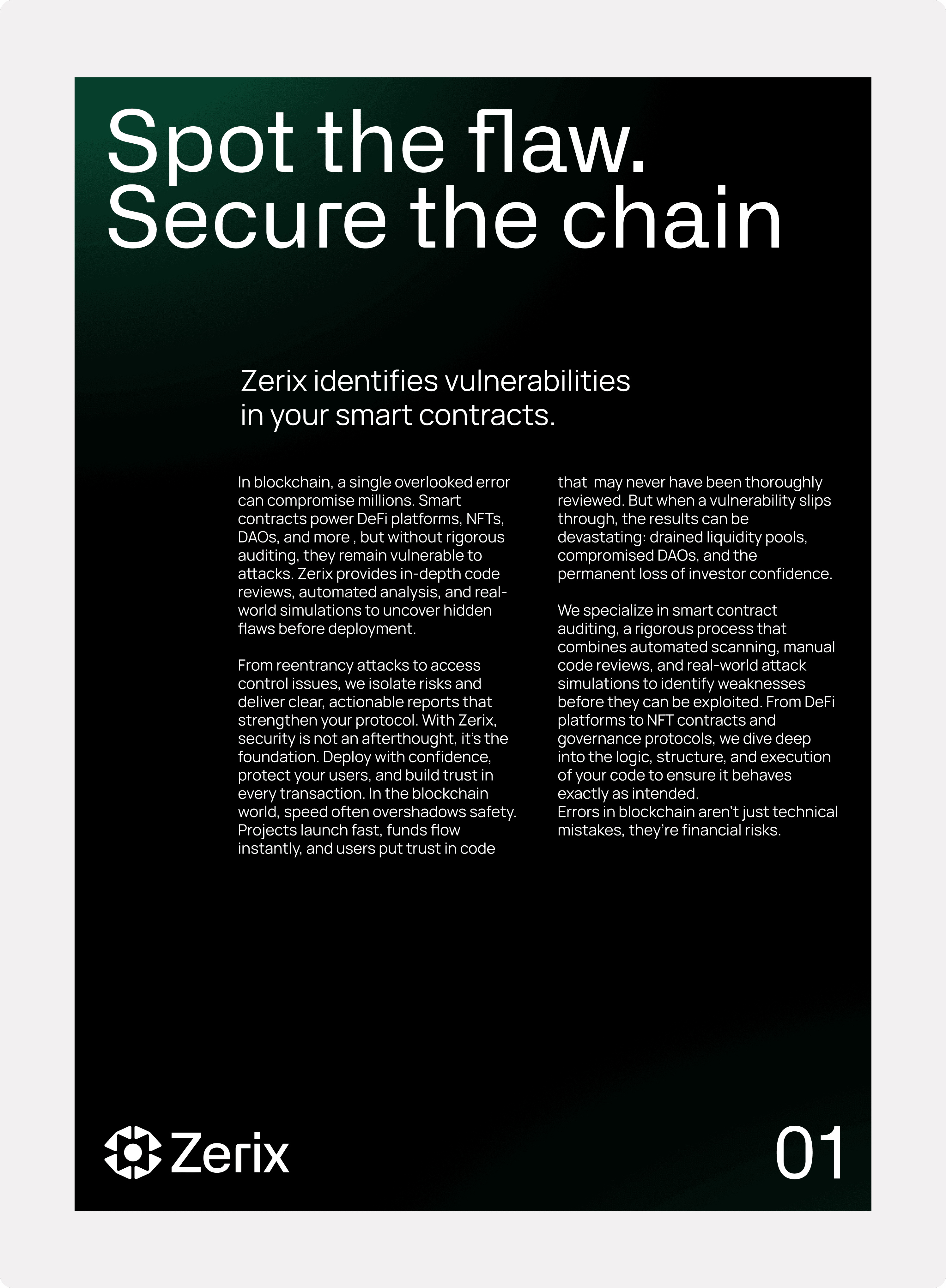 The logomark is built from multiple nodes converging toward a single point, a direct visual metaphor for blockchain: independent nodes coming together to form a secure network. At the center sits a circle that represents completeness and integrity, the core of Zerix’s mission: to make code whole and trustworthy. The overall silhouette reads as an eye, signaling Zerix’s scrutiny and vigilance: we see what others miss.